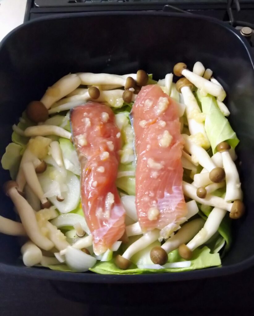 - フライパンにキャベツを広げるように敷き、玉ねぎ、にんにく、さけの順に重ねる。しめじをまわりに散らす。