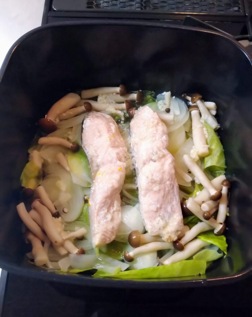 蒸し煮終わったところ。サケに火も通り野菜がくたっとして食べごろです!