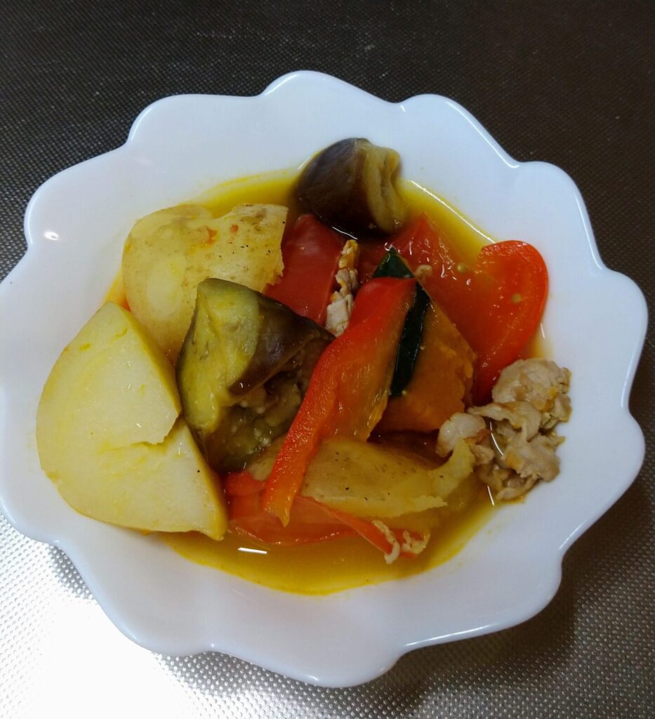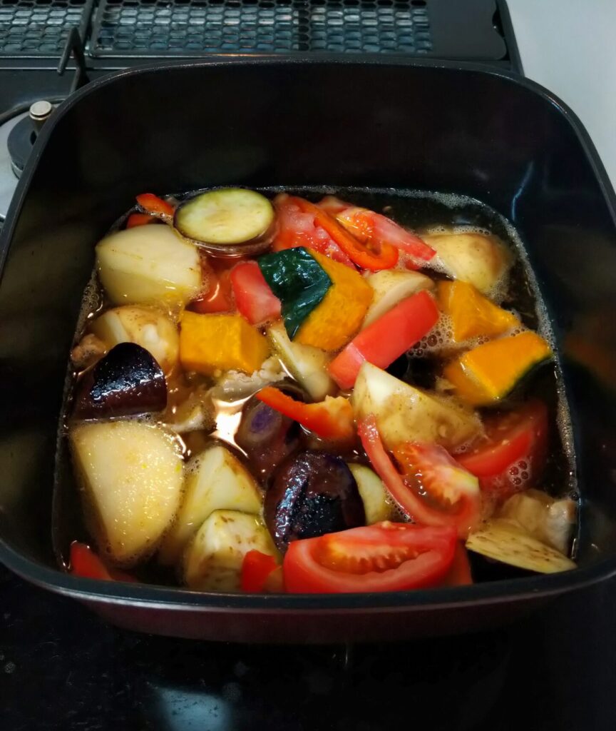 - トマトは8等分のくし形切り、かぼちゃ、なすは乱切り、パプリカは縦4等分に切る。じゃがいもは大きいものは半分に切る。